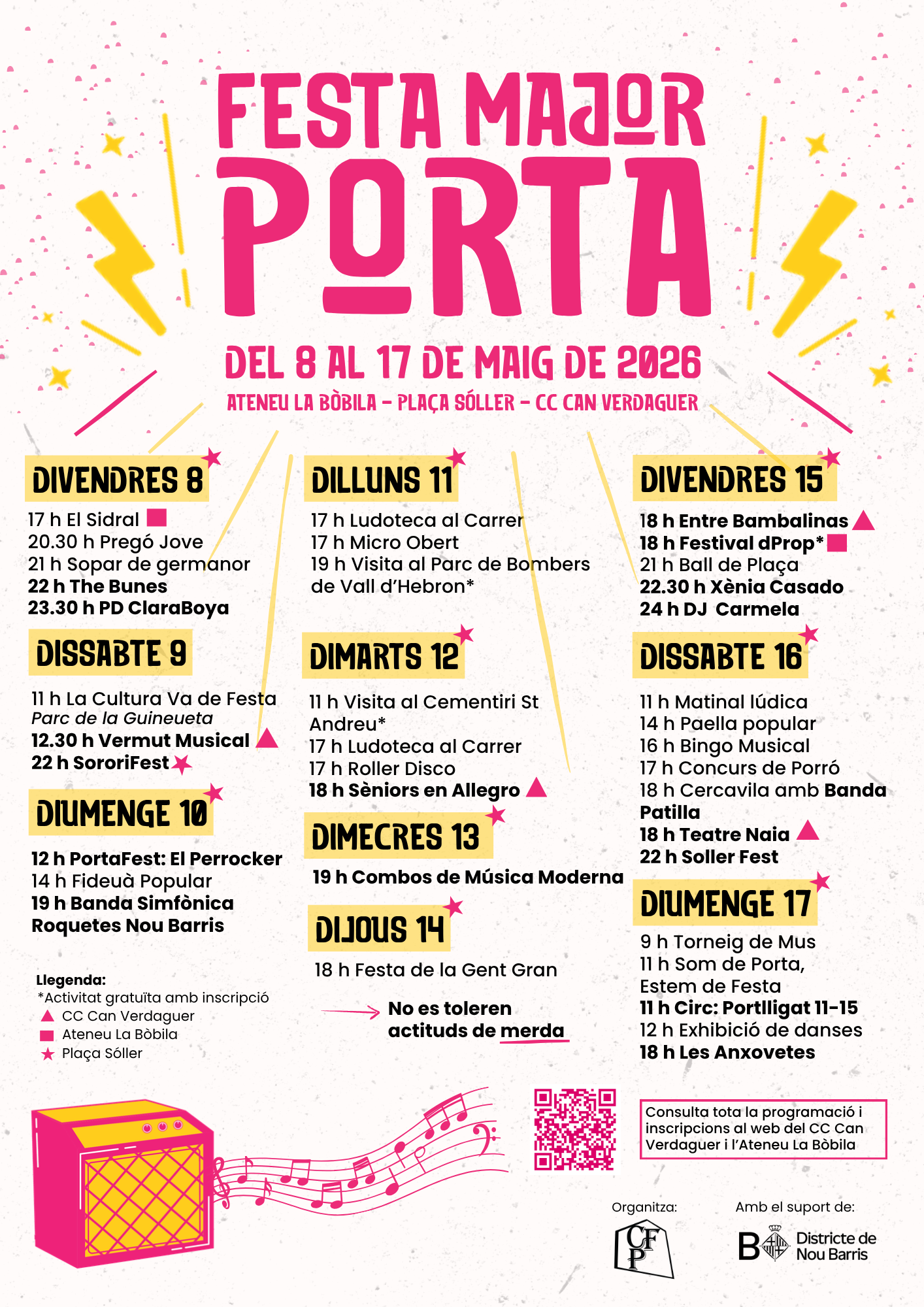 Festivalin açılışı, 8 Mayıs Cuma akşamı Kasal de Joves (Gençlik Merkezi) tarafından Plaça de Sóller'de yapılacak olan "pregó" (açılış konuşması) ile gerçekleşecek. Ardından "sopar de germanor" (kardeşlik yemeği) ile mahalle sakinleri bir araya gelecek ve akşam konserlerle devam edecek. Cumartesi ve pazar günleri ise "La cultura va de festa" (Kültür Parti Yapıyor) gibi kültürel etkinlikler, "vermut musical" (müzikli vermut) ve "Sororifest" gibi konserler düzenlenecek. Özellikle 10 Mayıs Pazar günü yapılacak "fideuà popular" (halk fideuà yemeği), Barselona'da topluluk ruhunu en iyi yansıtan etkinliklerden biri olarak öne çıkıyor.